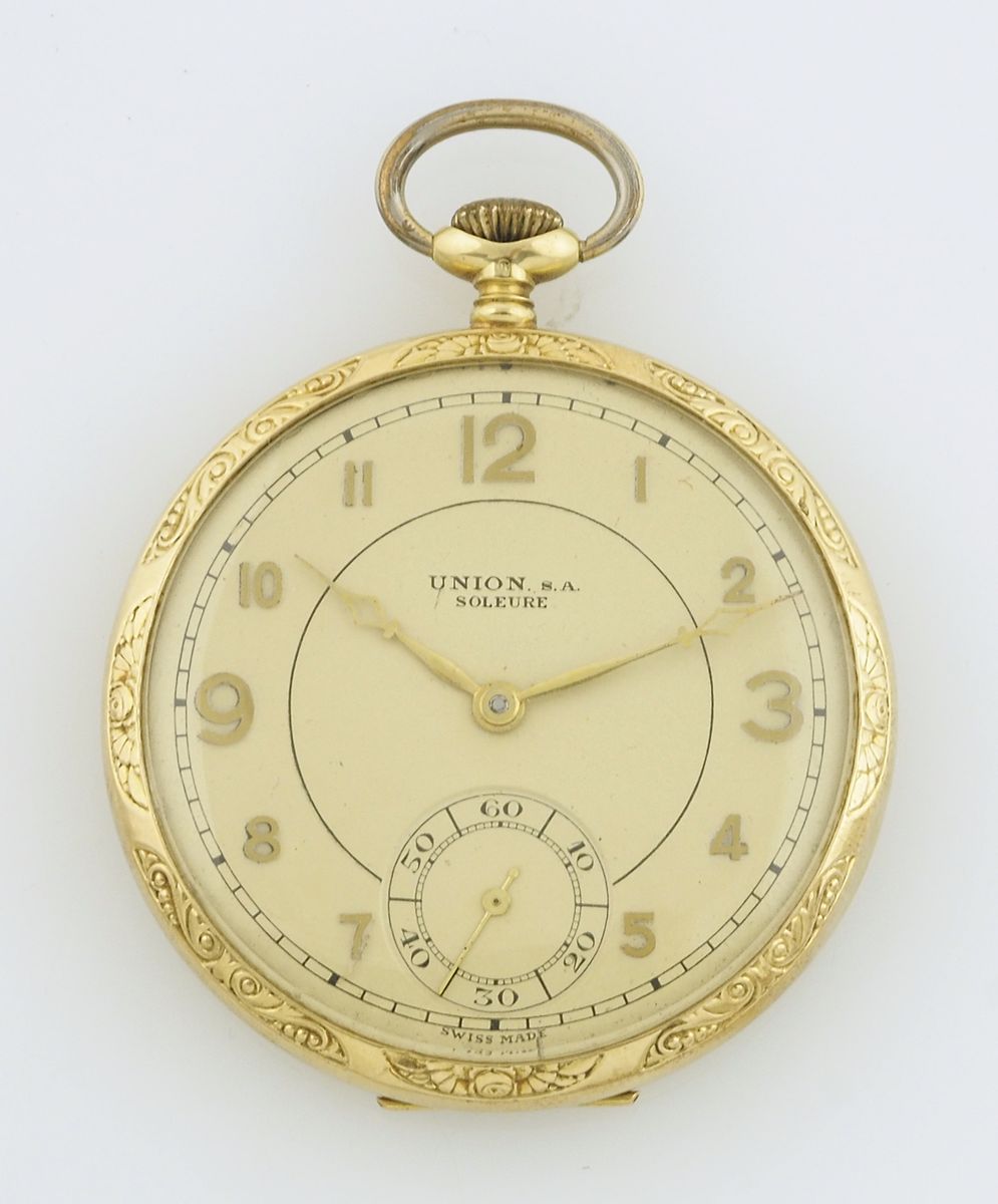 Union: orologio da tasca in oro 14Kt con cassa incisa ai bordi, quadrante con secondi al 6. Diam. cm. 4,8.