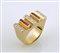 Anello Deco in oro giallo composta da 3 file di diamanti taglio brillante intervallate da 2 file di rubini. Misura 14.