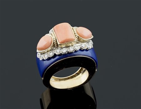Anello in oro giallo a cupola con smalto blu e 3 coralli cabochon contornati da diamanti taglio brillanti. Misura 16.