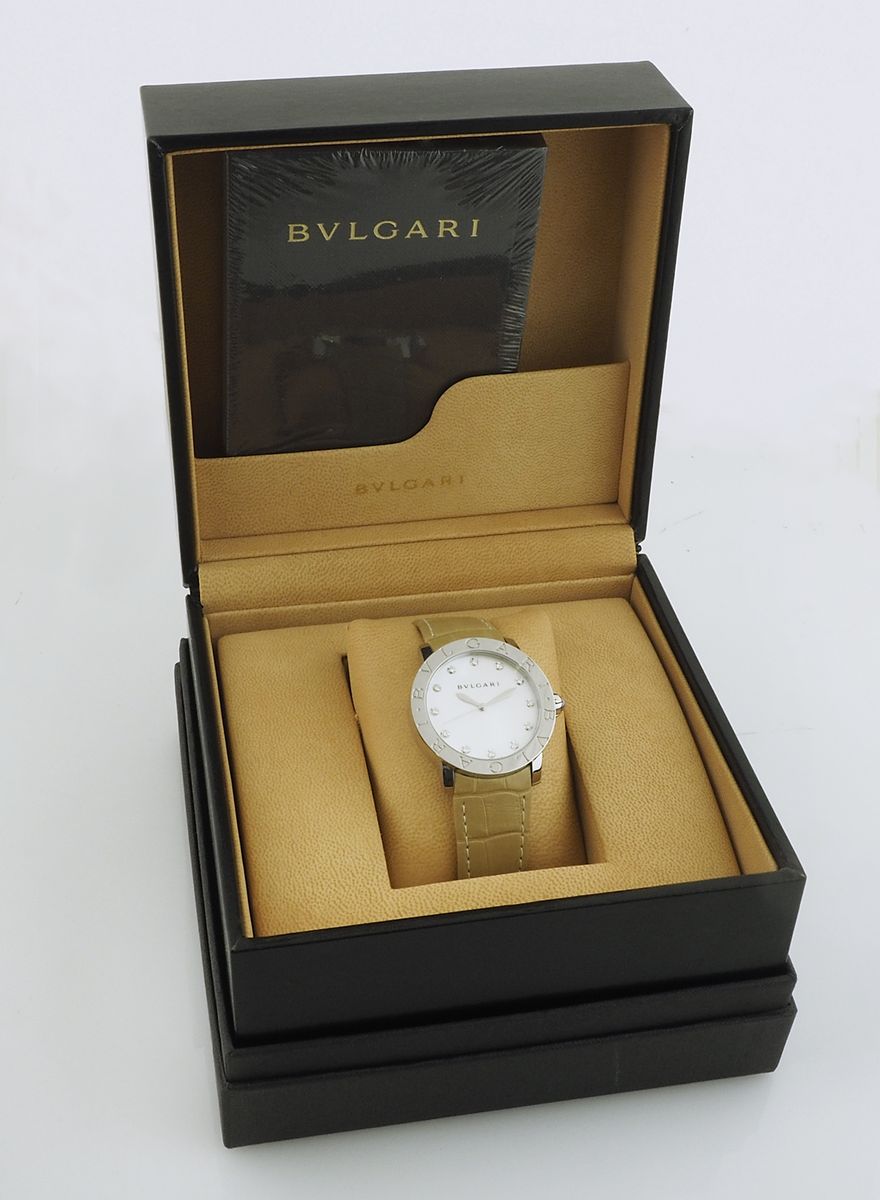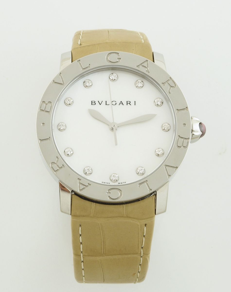Bvlgari: orologio da polso in acciaio con cassa rotonda e quadrante madreperla e diamanti, cinurino in pelle. Con scatola e garanzia. Pari al nuovo.