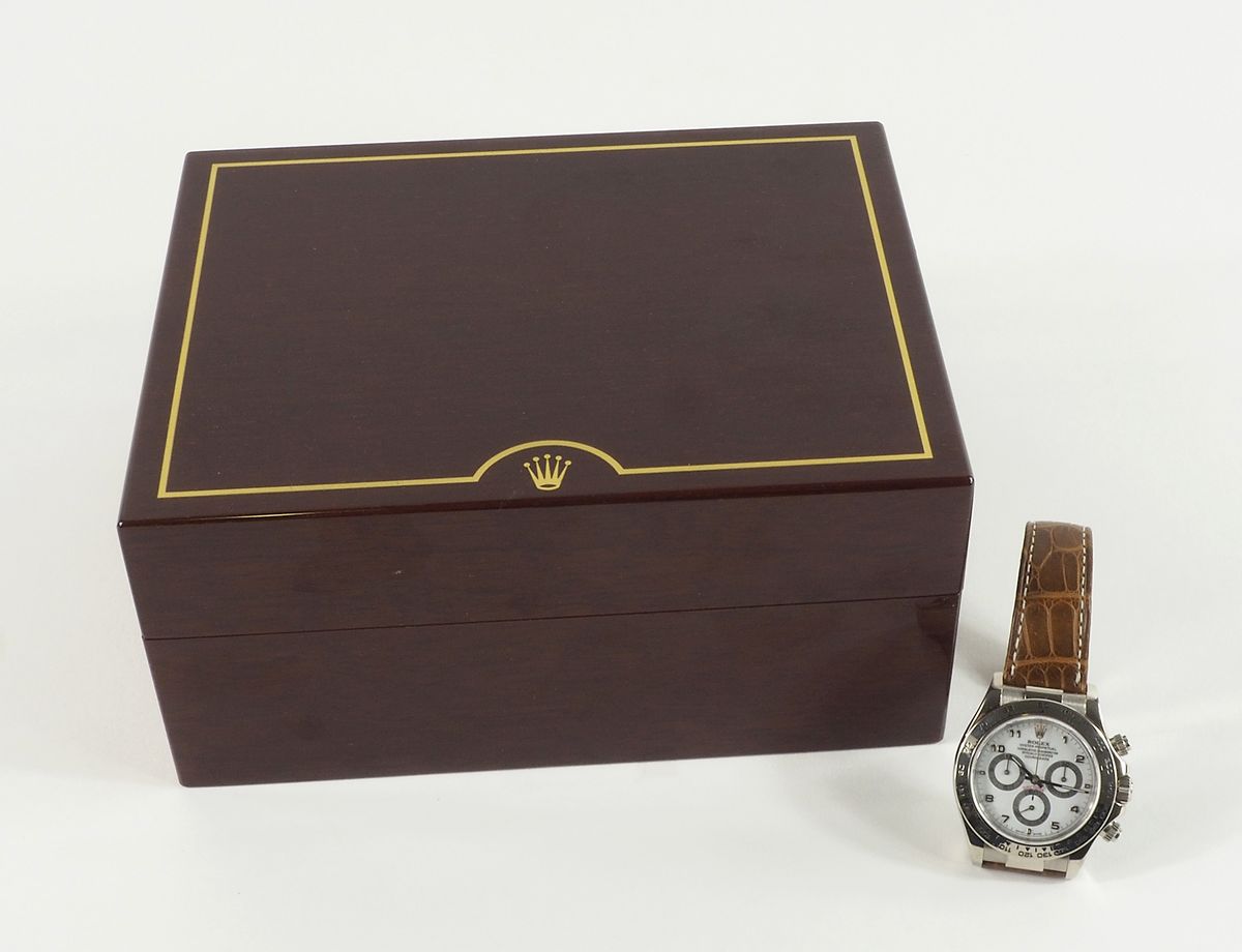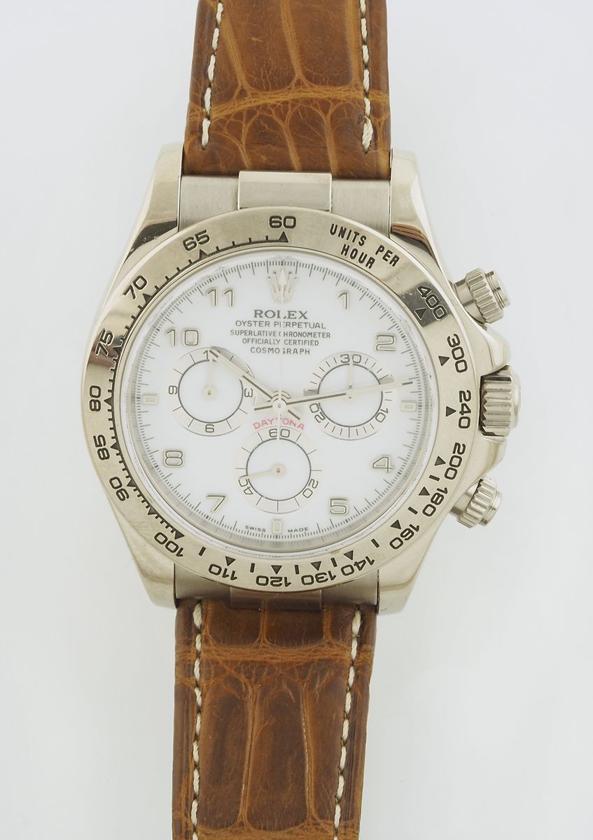 Rolex: cronografo da polso Daytona in oro bianco, quadrante bianco, cinturino in pelle con chiusura Rolex in oro bianco. Con scatola e garanzia.