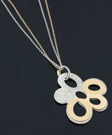 Catena in oro bianco e oro giallo con pendente in oro a due colori. gr. 7,8.