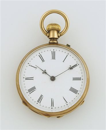 Orologio da tasca in oro 14Kt a tripla cassa, quadrante con numeri romani. Diam. cm. 3,2.