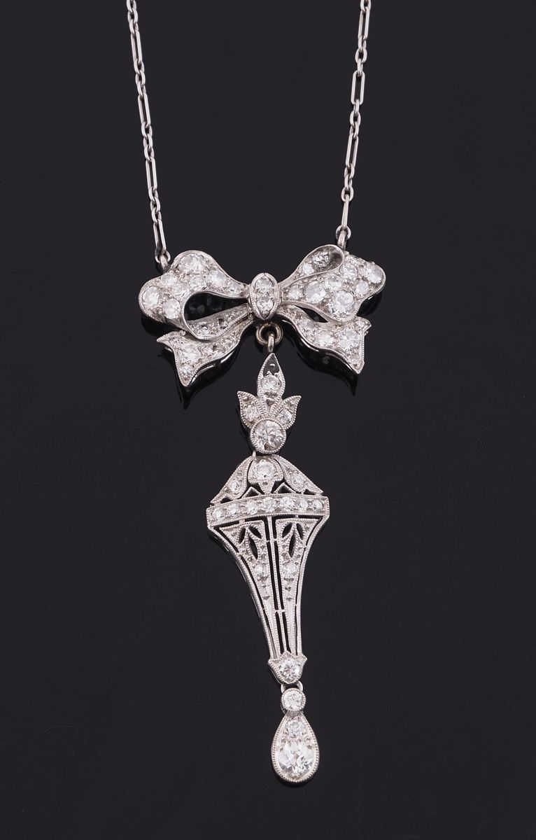 Girocollo con pendente a forma di fiocco in platino e diamanti, anni '20
