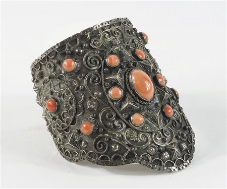 Bracciale rigido in argento finemente lavorato a motivi orientali, applicazioni di coralli. Punzone Fascio FI.