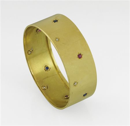 Bracciale rigido in oro giallo con diamanti, rubini e zaffiri. gr tot 60.