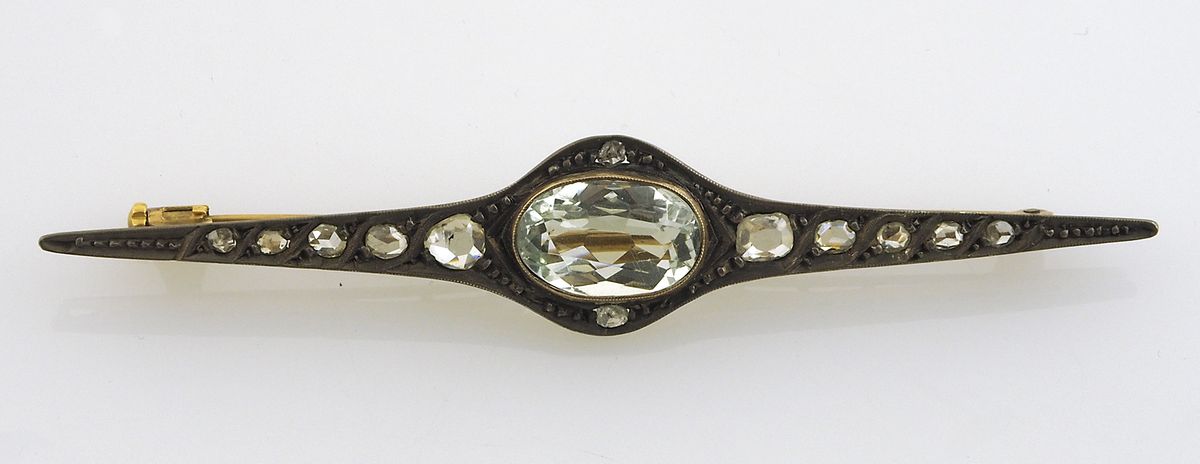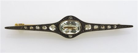 Spilla a losanga in oro giallo e bianco con al centro topazio azzurro (?), ai lati diamanti.Primi '900