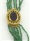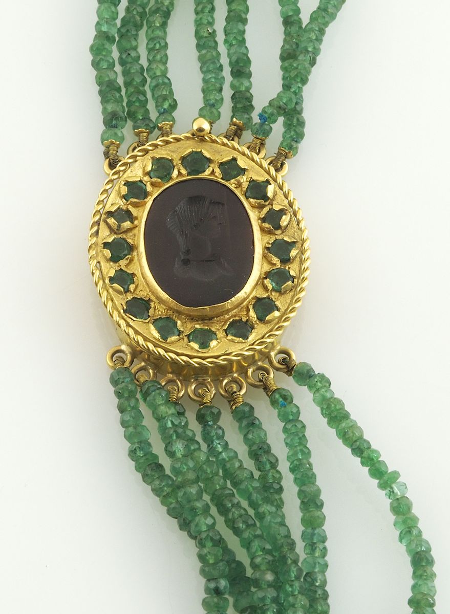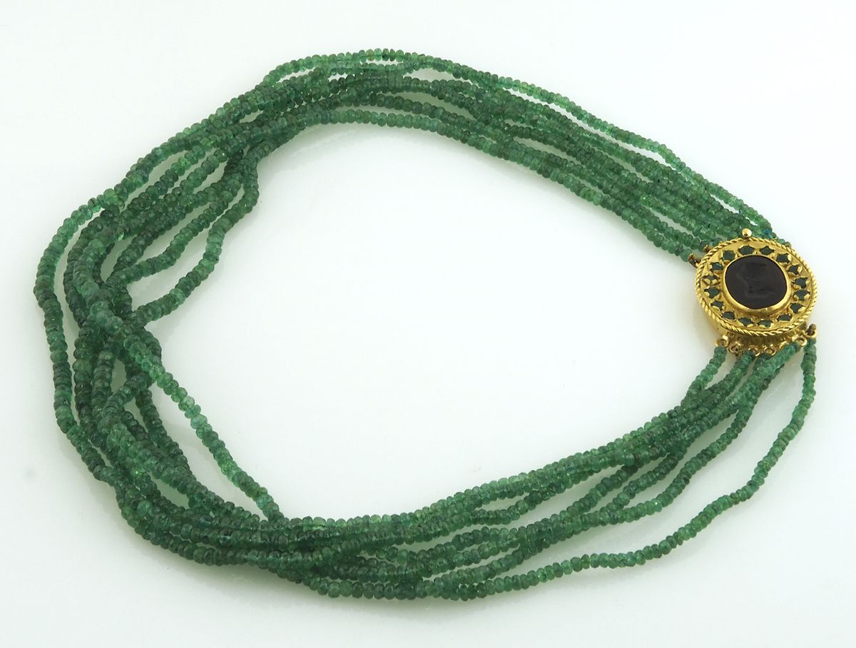 Collana a 6 fili di smeraldi sfaccettati con chiusura ovale in oro giallo con al centro pietra dura color rosso con incisa figura di ragazza.
