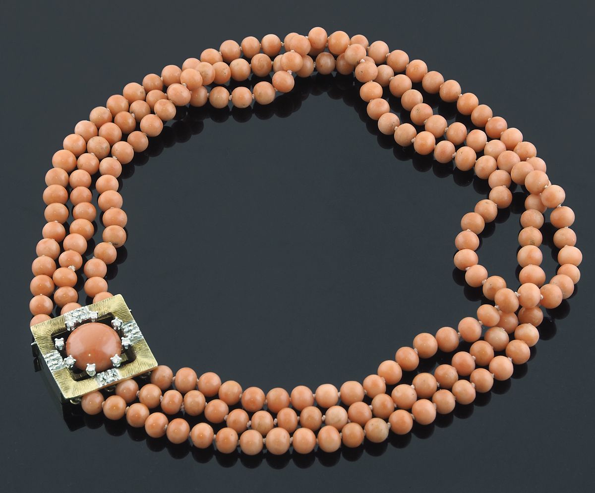 Collana a 3 fili di corallo con chiusura quadrata in oro giallo con diamanti taglio brillante