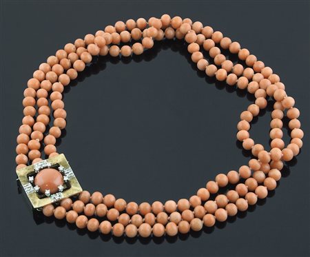 Collana a 3 fili di corallo con chiusura quadrata in oro giallo con diamanti...