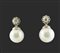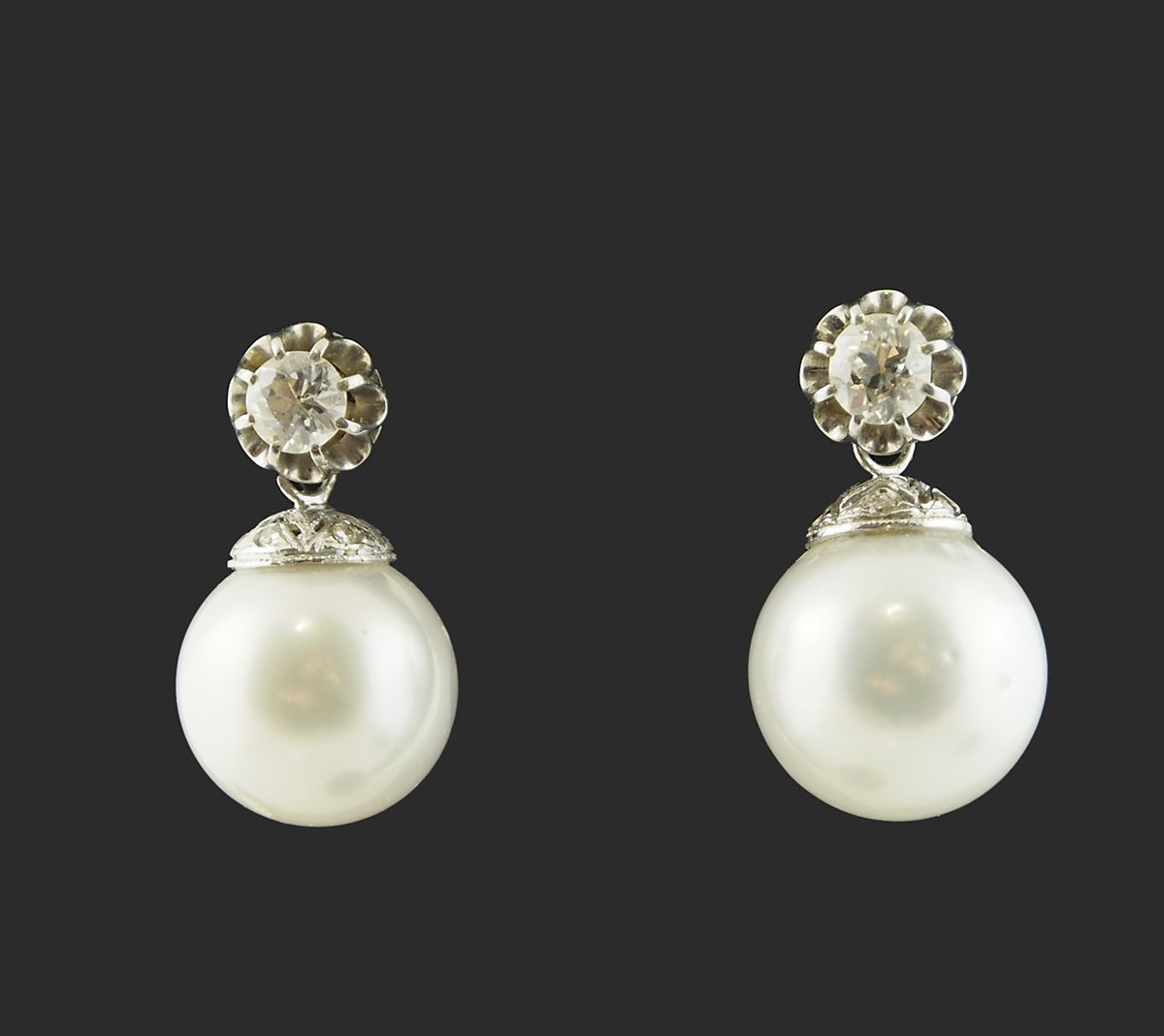 Orecchini in oro bianco a doppio corpo con parte superiorie a bottone centrato da diamante taglio antico per tot ca ct 1,60 finale di perla Australiana di mm 16, chiusura perno e farfalla