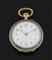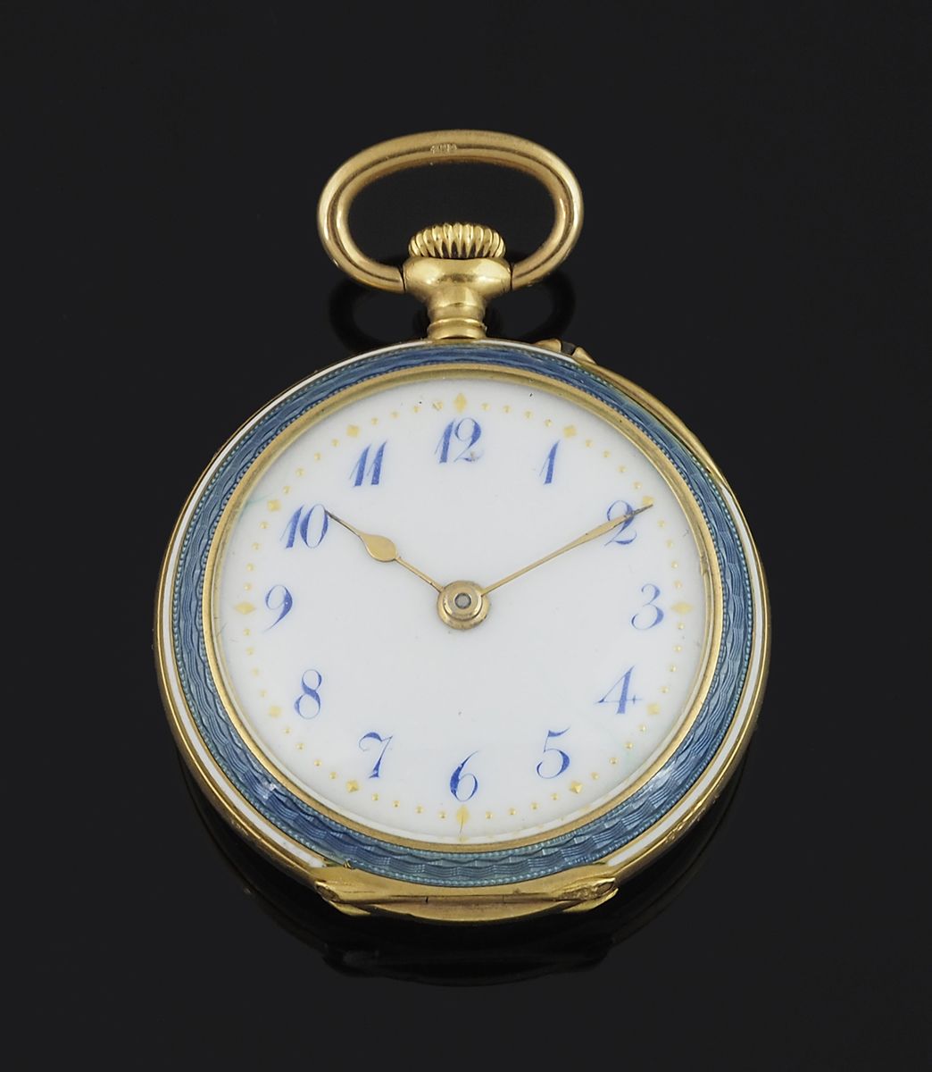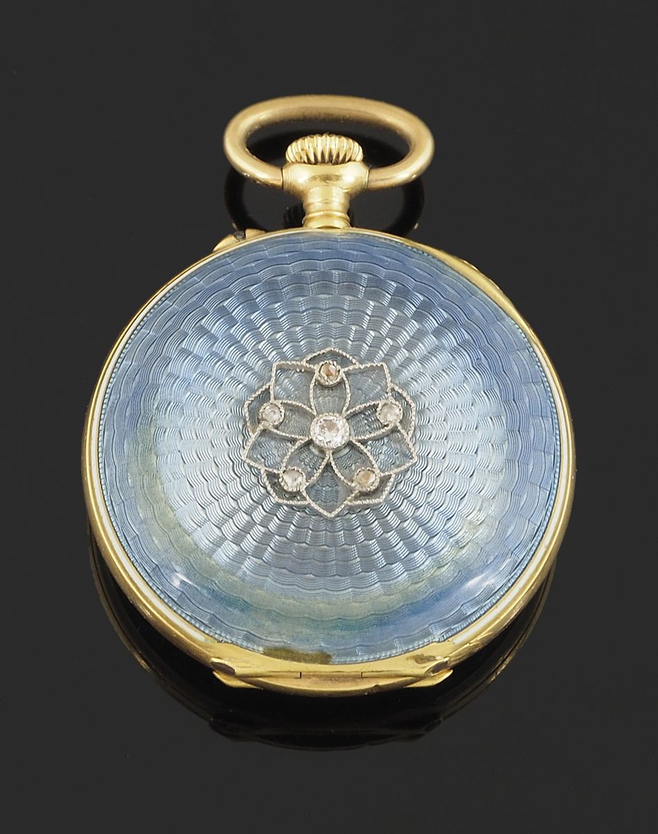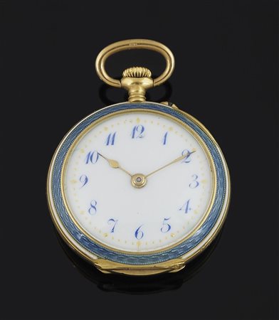 Piccolo orologio da tasca in oro giallo e smalti azzurri. Diam. 32mm.