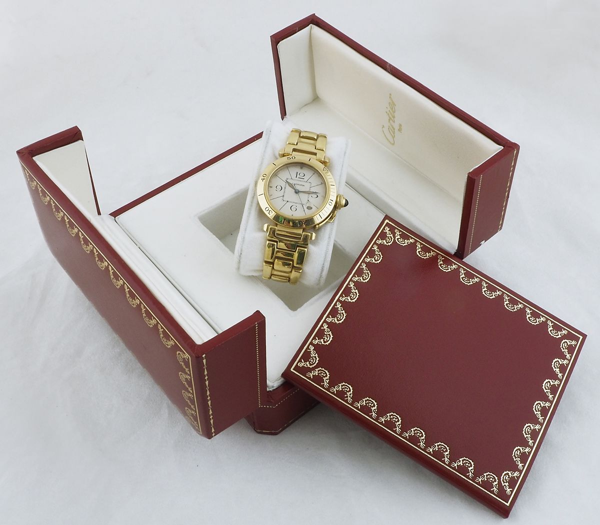 Cartier: orologio da polso in oro giallo modello Pasha con datario a ore 4, cinturino originale in oro giallo.Con scatola e garanzia datata 1992 originali.