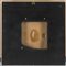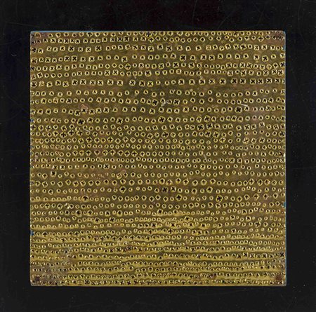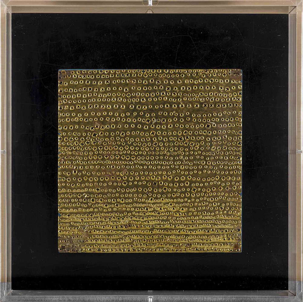 Lastra metallica perforata su pannello in legno entro teca in plexiglass