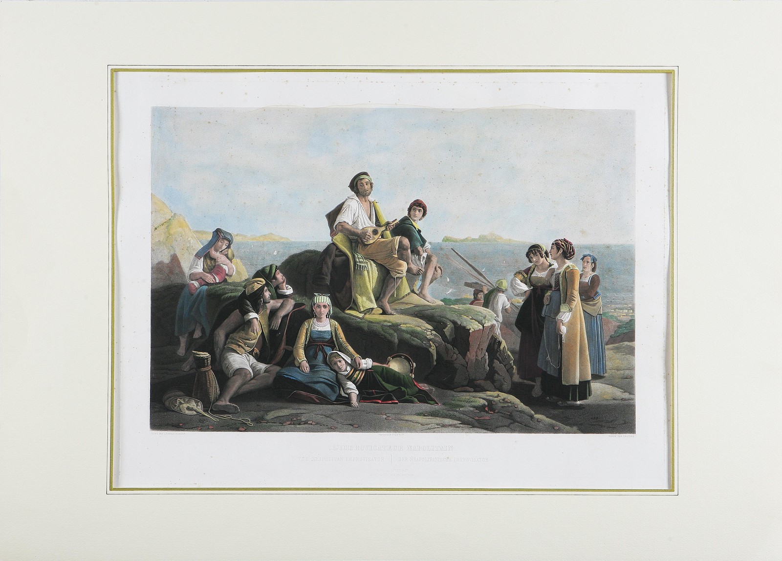 GAUTIER LOUIS ADOLPHE Menestrello napoletano. 1850. Acquatinta. Cm 70,5x55. Attivo a Parigi verso la metà del XIX secolo. Incisione calcografica all’acquatinta con acquerellatura non coeva tratta da un dipinto di Leopold Robert - Parigi 1850 ca. - Dim. del foglio con ampi margini: L. 70.5 x 55 cm. (dim. della sola parte incisa senza le lettere: L. 52,3 x 35 cm.).Bibliogr.: MILESI, 160 - H. BERALDI, VI, 249-250 - E. BENEZIT, II, 390 (Ed. del 1918) - H. MIREUR, III, 266.