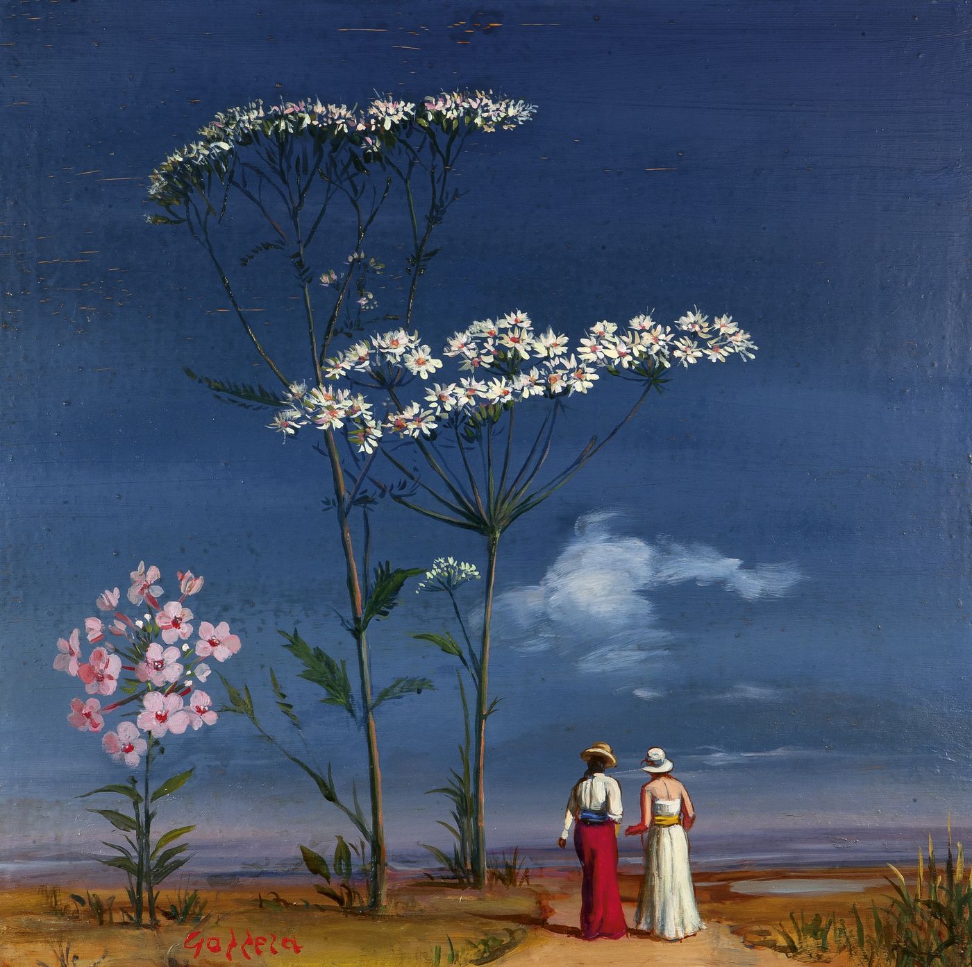 GAZZERA ROMANO Ciriè (TO) 1908 - 1985 "Passeggiata sotto i pizzi della regina" 1975 50x50 olio su compensato Opera firmata in basso a sinistra e al retro con data e titolo Autentica della moglie Clarissa Gazzera su fotografia in data 7 ottobre 2011