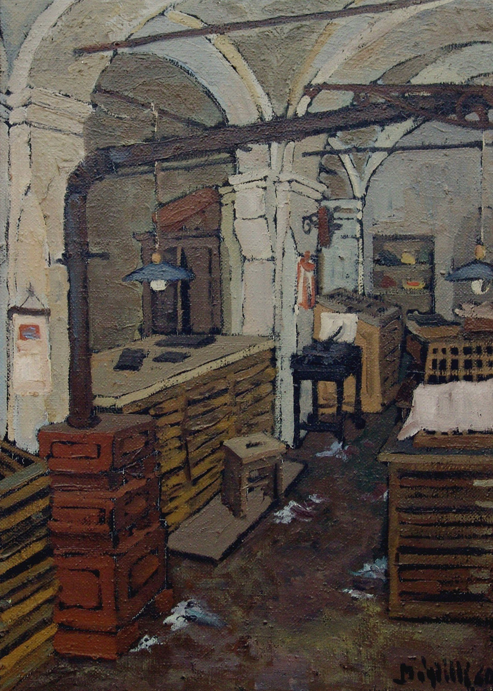 Paolo Magri Tilli 1923, Cattolica (Rn) - 1999, Macerata (Mc) - [Italia] Dal tipografo olio su tela applicata su tavola 85x60 cm 1960 firma dell’artista in basso a destra; opera con cornice certificato di autenticità Picenum