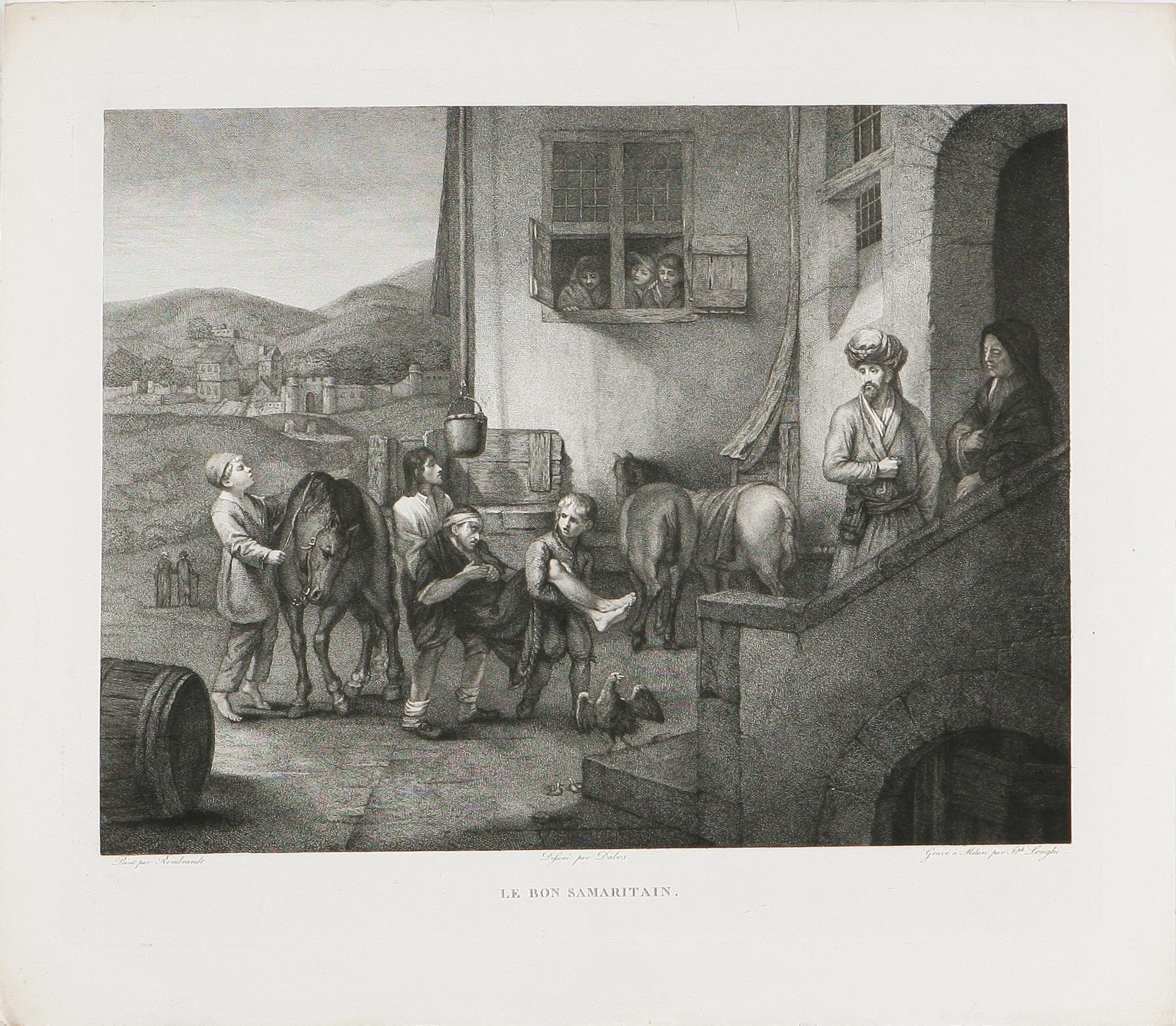 LONGHI GIUSEPPE (1766 - 1831) Il buon samaritano. Bulino. Cm 42,3x37,2. Incisione a bulino tratta da un dipinto di Rembrandt e disegnato da Dabos - Milano primi ‘800 - Dim. del foglio con ampi margini L. 42,3 x 37,2 cm. (dim. della sola parte incisa, esclusa delle lettere L. 35 x 26,9 cm.) - 3° stato su 3.Bibliogr.: LE BLANC, II, 567-568 - H. BERALDI, IX, 189-190 - VALLARDI, 120-122 - MILESI, 213 - La Calcografia propriamente detta - GIUSEPPE LONGHI, pag. 413 (2)