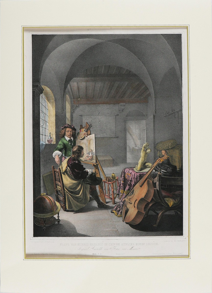 HANFSTAENGL FRANS SERAPH (1804 - 1877) Franz van Mieris del suo studio. 1837. Litografia. Cm 50x68,5. Incisione litografica con acquerellatura non coeva tratta dai dipinti presenti nella Galleria di Dresda - Monaco 1837 - Dim. dell’intero foglio con ampi margini L. 50 x 68,5 cm. (dim. della sola parte incisa senza le lettere L. 35,5 X 47,5 cm.).Bibliogr.: MILESI, 177 - BENEZIT, II, 547 (Ed. del 1918) - BRYAN’S, III, 13 - SCHEENEVOOGT, n° 85, 74.