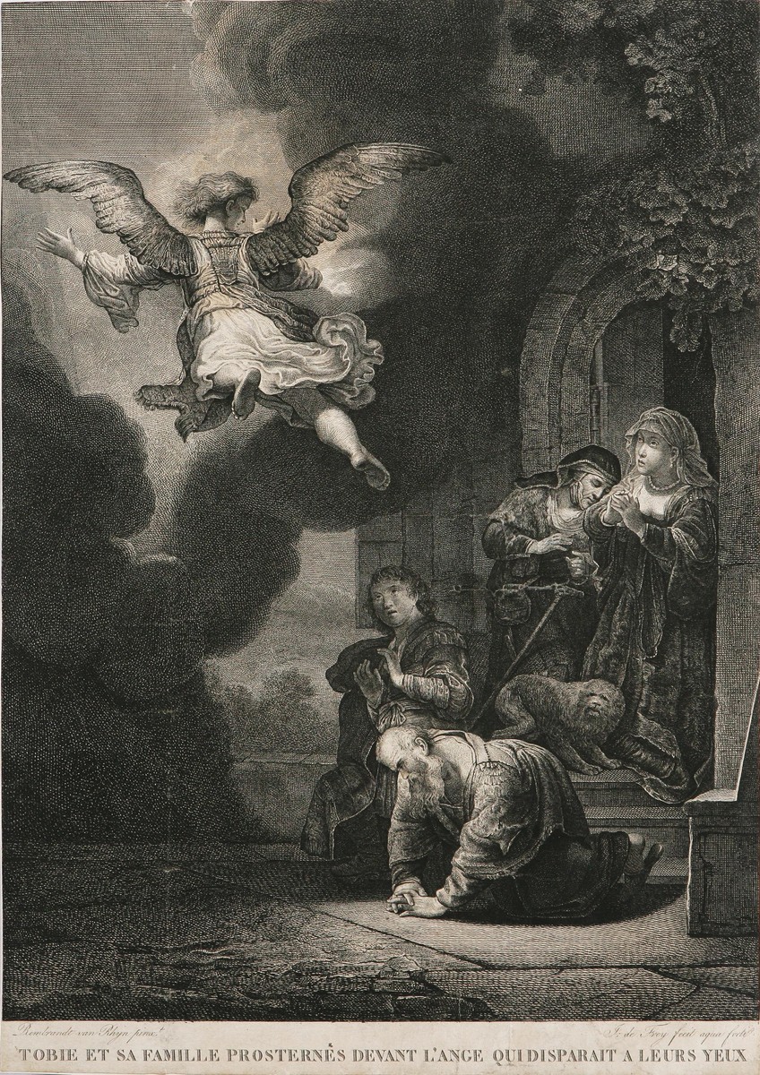 FREY JAKOB (1681 - 1752) Tobia e la sua famiglia davanti all'angelo. 1710. Acquaforte. Cm 27,3x38,3. Incisione calcografica all’acquaforte contro fondata, tratta da un dipinto di Rembrandt - Roma 1710 ca. - Dim. della stampa rifilata all’inciso con piccolo marginino inf. L. 27,3 X 38,3 cm. Bibliogr.: E. BENEZIT, IV, 522 (Ed. del 1976) - MILESI - BRIAN’S, II, 196-197 - JOUBERT, II, 58-61. - LE BLANC, II, 252-253 - S. TICOZZI, II, 120-121.