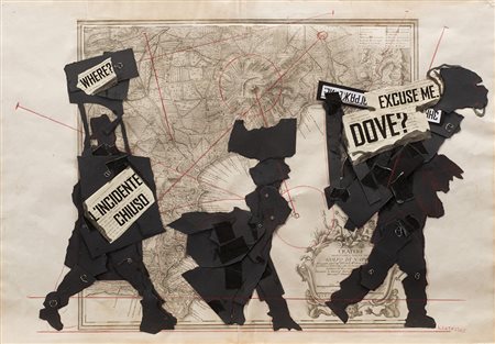 matita, collage di carte, nastro adesivo e puntine su mappa geografica