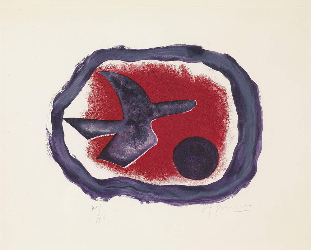 Georges Braque, Argenteuil 1882 - Parigi 1963, Oiseau sur fond carmine (Oiseau XIV), 1958, Acquaforte a colori, es. 70/75, cm. 32,5x43 (lastra), cm. 50x60 (carta), Firma a matita sul margine in basso a destra: G. Braque, tiratura in basso a sinistra: 70/75., Certificato Maeght Éditeur, Parigi, 12 novembre 1980., Tiratura di 75 esemplari in numeri arabi, alcune H.C. e alcune prove d'artista, stampatore Crommelynck et Dutrout, Parigi, editore Maeght, Parigi., Bibliografia: Dora Vallier, Braque. L'oeuvre gravé, catalogue raisonné, Flammarion, Parigi, 1982, p. 180, n. 123.