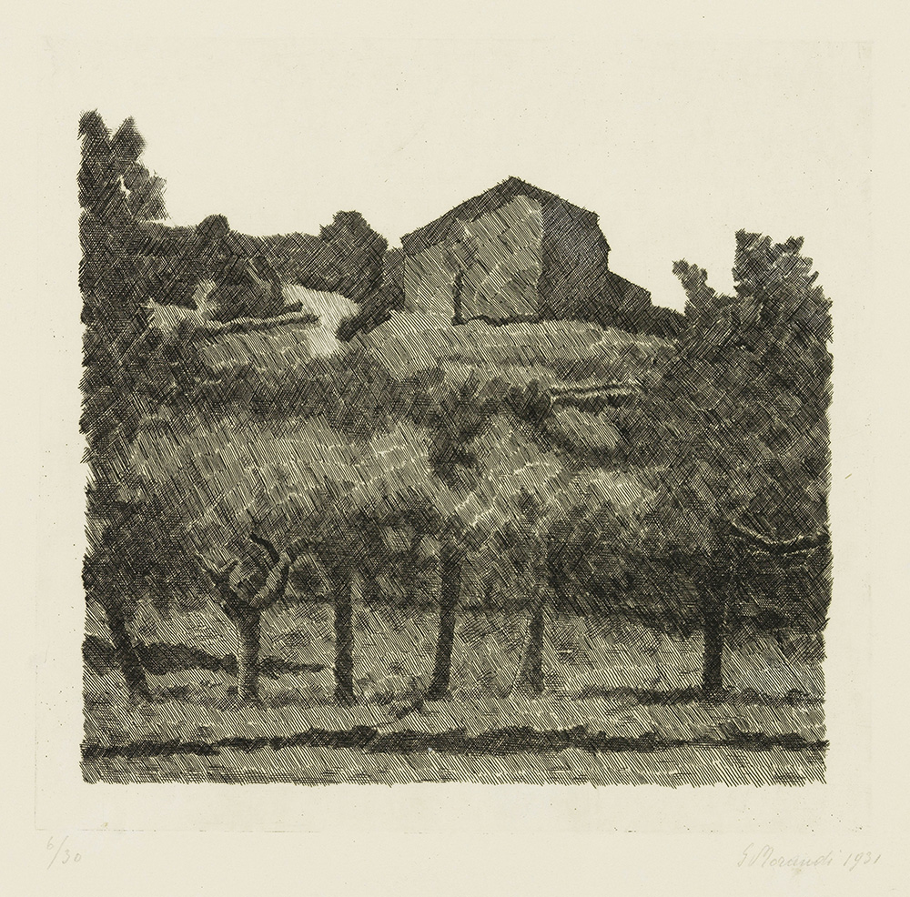 Giorgio Morandi, Bologna 1890 - 1964, Paesaggio di Grizzana, le Lame, 1931, Acquaforte su rame, es. 6/30, cm. 24,8x23,5 (lastra), cm. 36x37,4 (carta), Firma e data a matita sul margine in basso a destra: G. Morandi 1931, tiratura in basso a sinistra: 6/30., Secondo stato su tre; tiratura di 30 esemplari numerati e due prove., Bibliografia: Lamberto Vitali, L'opera grafica di Giorgio Morandi, Giulio Einaudi Editore, Torino, 1964, n. 89;, Michele Cordaro, Morandi incisioni. Catalogo Generale, Edizioni Electa, Milano, 1991, p. 100, n. 1931 8.