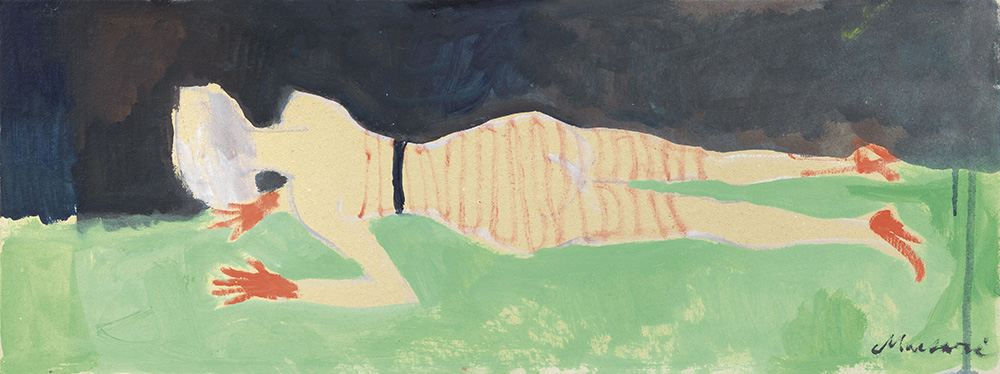 Mino Maccari, Siena 1898 - Roma 1989, Scarpette rosse, Olio su cartone, cm. 27x72, Firma in basso a destra: Maccari. Al verso: etichetta Galleria d'Arte Narciso, Torino, con n. MAC.M/10.