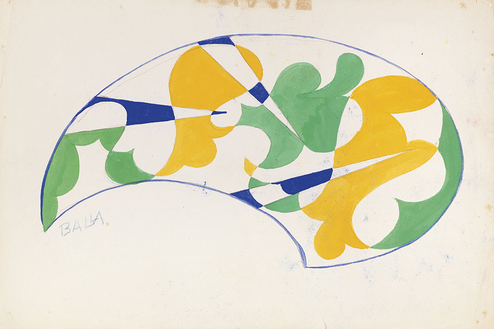 Giacomo Balla, Torino 1871 - Roma 1958, Motivo per ricamo giallo, verde e cobalto, 1918 ca., Tempera, acquerello e matita su carta Nettunia, cm. 21,1x31, Firma in basso a sinistra: Balla., Storia: Casa Balla, Roma; Collezione privata, Certificato su foto di Elena Gigli, Roma, 2 maggio 2018, con n. 802.