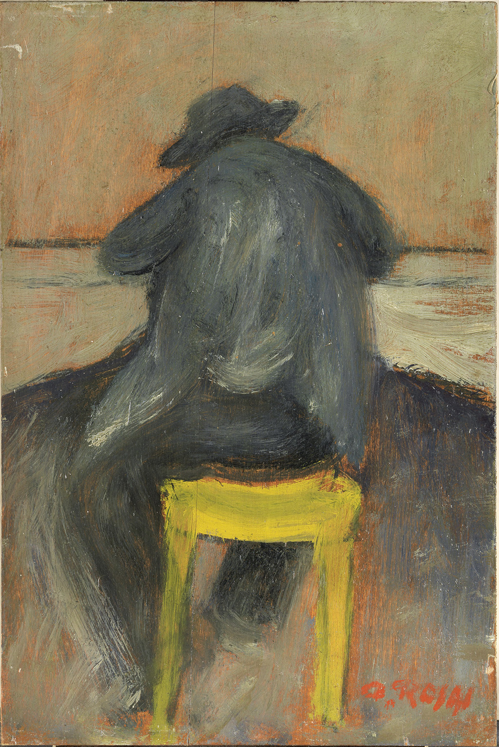 Ottone Rosai, Firenze 1895 - Ivrea (To) 1957, Omino all'osteria, 1946 ca., Olio su tavola, cm. 27,2x18, Firma in basso a destra: O. Rosai., Storia: Collezione Giampieri, Firenze; Collezione privata, Milano; Collezione privata, Certificato su foto di Luigi Cavallo, Milano, 24 novembre 2006., Bibliografia: Giovanni Faccenda, Catalogo Generale Ragionato delle Opere di Ottone Rosai. Primo Volume, Editoriale Giorgio Mondadori, Milano, 2018, p. 460, n. 255.