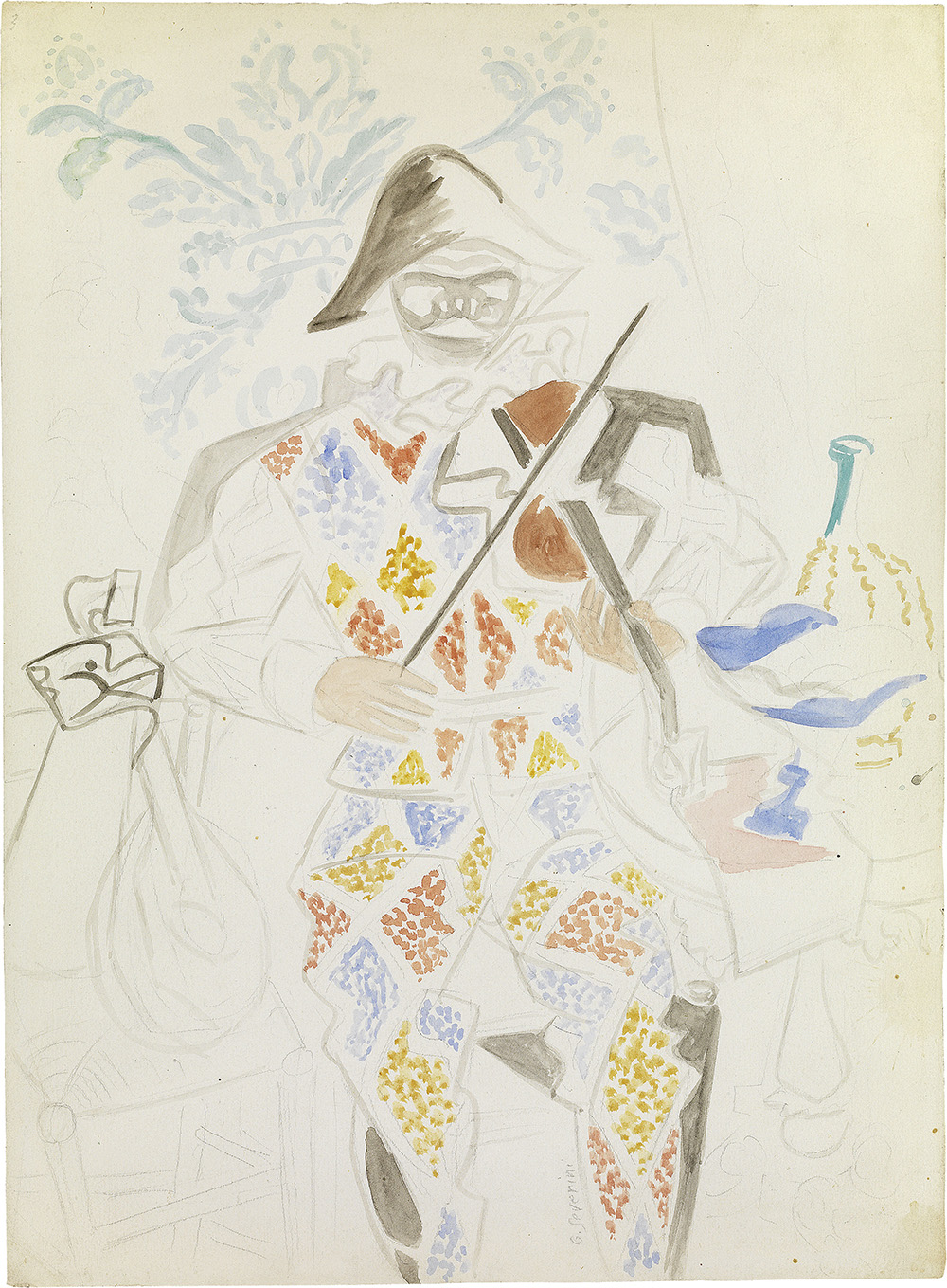 Gino Severini, Cortona (Ar) 1883 - Parigi 1966, Arlecchino col violino, 1943 ca., Acquerello e matita su carta applicata su cartoncino, cm. 36,5x26,2, Firma al centro: G. Severini., Certificato su foto di Gina Severini Franchina; certificato su foto di Romana Severini Brunori, Roma, 21/9/2012, dichiarazione n. 15 del settembre 2012., Bibliografia: Daniela Fonti, Gino Severini. Catalogo ragionato, Mondadori - Daverio, Milano, 1988, p. 485, n. 698 A.