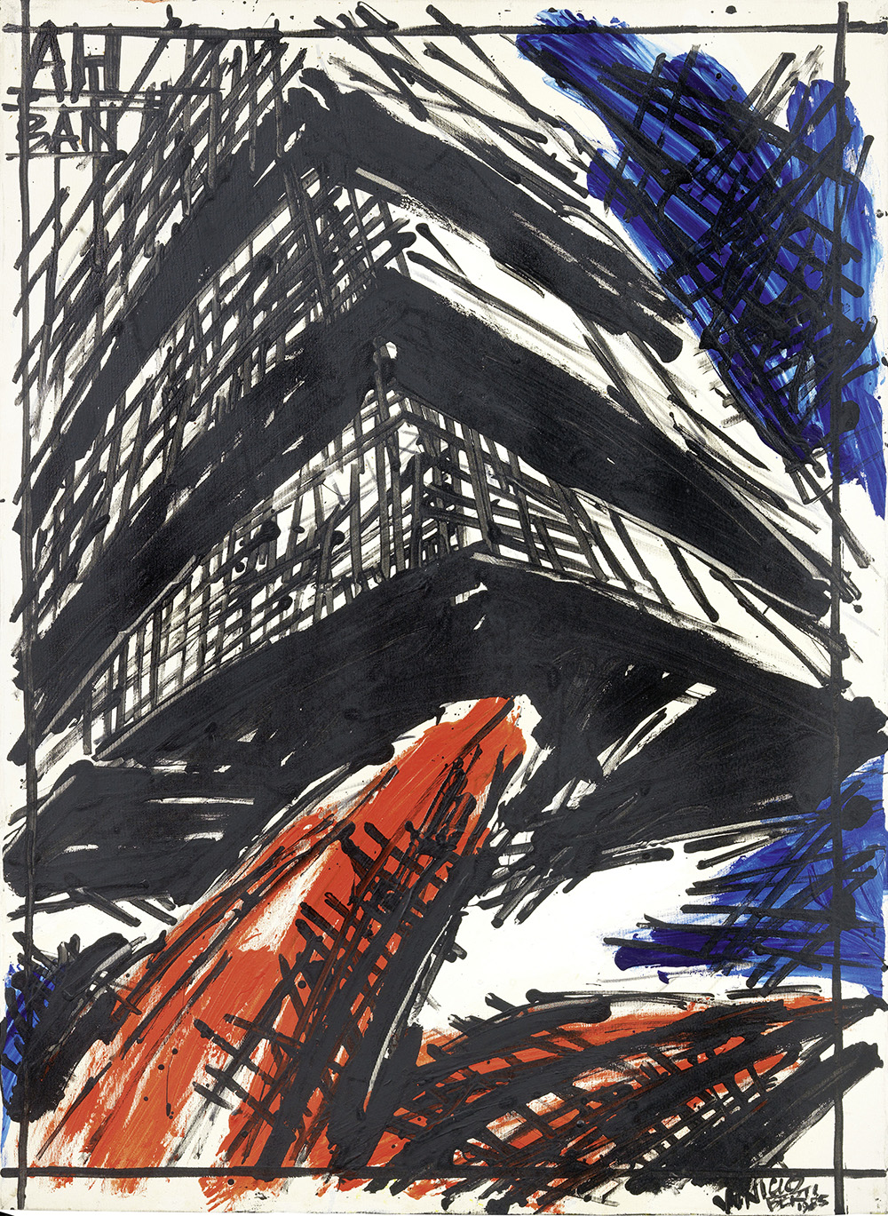 Vinicio Berti, Firenze 1921 - 1991, Grande Costruzione AH-BAN, 1985, Acrilico su tela, cm. 110x80, Firma e data in basso a destra: Vinicio / Berti / 1985; firma, titolo e data al verso sulla tela: Vinicio Berti / "Grande / costruzione / AH-BAN" / 1985.