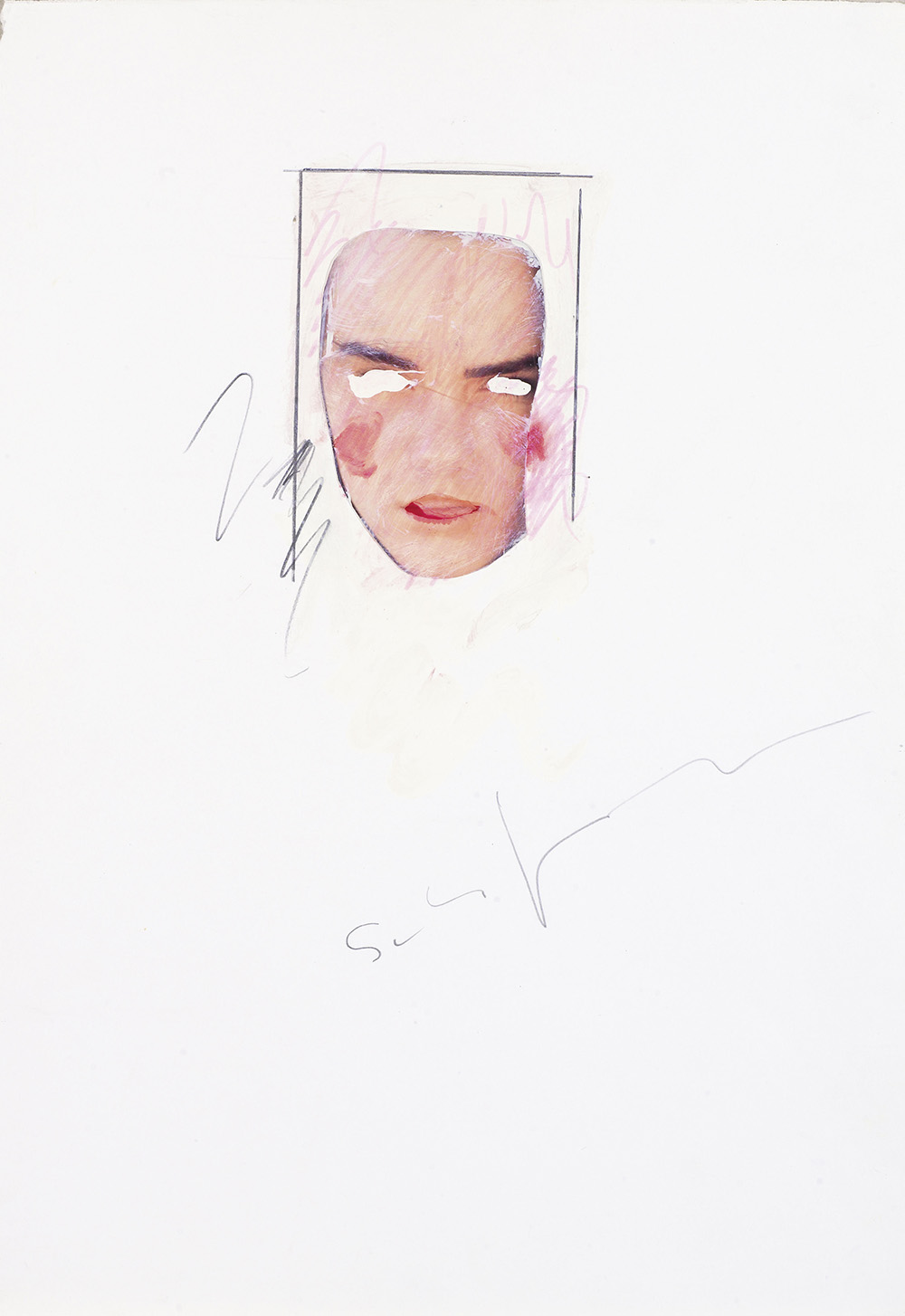Mario Schifano, Homs 1934 - Roma 1998, Senza titolo, seconda metà anni Settanta, Tecnica mista su carta, cm. 49,4x34,4, Firma al centro: Schifano., Bibliografia: Studio metodologico riguardante la catalogazione informatica dei dati relativi alle opere di Mario Schifano presenti presso la Fondazione M. S. Multistudio. Vol. B)IV° Opere su carta 1955 - 1998, Università degli studi di Genova, 2007, p. 104, n. SM70/315.