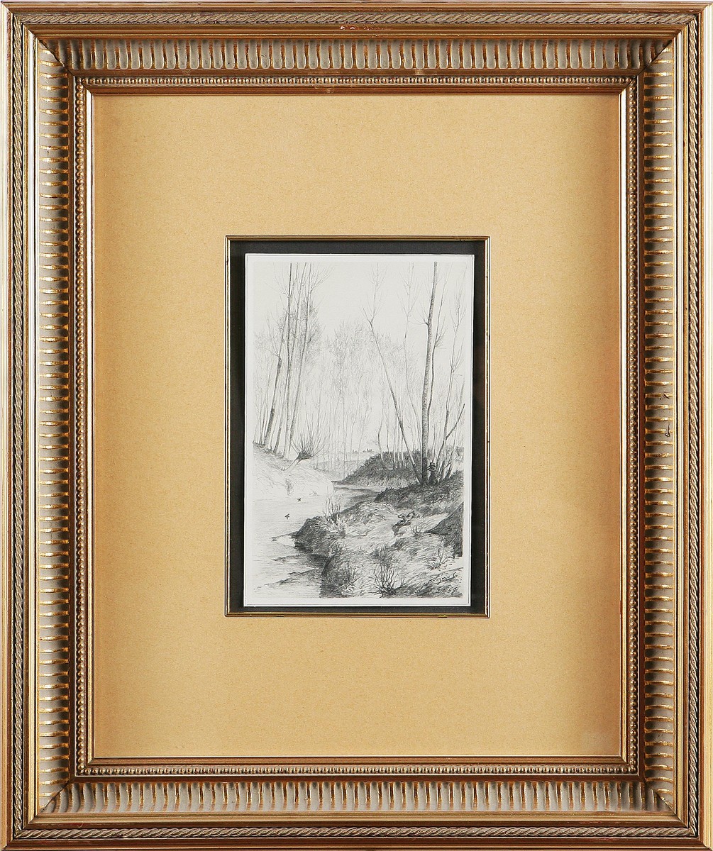 ANONIMO DEL XIX SECOLO Paesaggio invernale con cacciatore. Matita su carta....