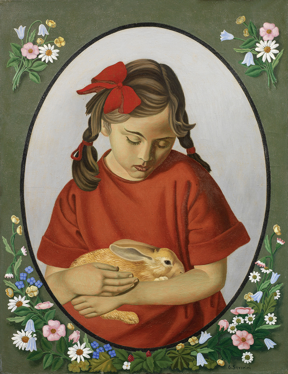 Gino Severini, Cortona (Ar) 1883 - Parigi 1966, La fillette au lapin, 1922, Olio su tela, cm. 65x50; Firma in basso a destra: G. Severini; al verso sul telaio: G. Severini Juillet 1922 "La fillette au lapin": etichetta Società per le Belle Arti ed Esposizione Permanente, Milano / Il Novecento Italiano 1923-1933, 12 gennaio - 27 marzo 1983, cat. 124.; Storia, Collezione Rosenberg, Parigi;, Galleria Giulia, Roma;, Collezione privata, Ravenna;, Collezione privata; Esposizioni, Gino Severini "entre les deux guerres" 1919-1939, Roma, Galleria Giulia, 1980, cat. p. 57, illustrato;, Gino Severini, Milano, Galleria Daverio, 1982-1983, cat. n. 20, illustrato a colori;, Il Novecento italiano 1923-1933, Milano, Palazzo della Permanente, 12 gennaio - 27 marzo 1983, cat. n. 124, illustrato;, Gino Severini. Mostra in occasione del centenario della nascita, Firenze, Palazzo Pitti, 25 giugno - 25 settembre 1983, cat. pp. 177, 178, n. 71, illustrato a colori;, Bambini nel tempo. L'infanzia e l'arte, Mantova, Palazzo Te, 7 maggio - 4 luglio 2004, cat. p. 82, tav. XLI, illustrato a colori;, Artisti toscani a Parigi tra le due guerre, Cortina d'Ampezzo, Galleria d'Arte Frediano Farsetti, 28 dicembre 2006 - 7 gennaio 2007, poi Milano, Farsettiarte, 17 gennaio - 17 febbraio 2007, cat. n. 5, illustrato a colori;, Severini. L'emozione e la regola, a cura di Daniela Fonti e Stefano Roffi, Mamiano di Traversetolo (Parma), Fondazione Magnani Rocca, 19 marzo - 3 luglio 2016, cat. p. 87, n. 16, illustrato a colori.; Bibliografia, Lettera di Gino Severini a Léonce Rosenberg, 19 agosto 1922;, Daniela Fonti, Gino Severini. Catalogo ragionato, Mondadori - Daverio, Milano, 1988, p. 356, n. 394.; Opera dichiarata di interesse storico artistico con decreto ministeriale, Firenze, 10 agosto 2001, prot. n. 13435 P.