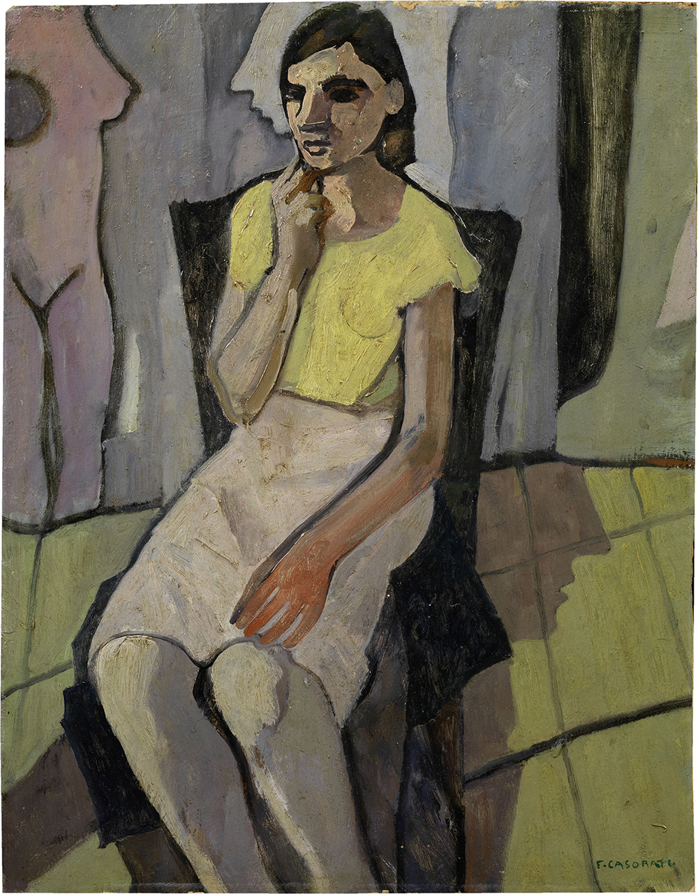 Felice Casorati, Novara 1883 - Torino 1963, Ragazza seduta (con l'abito chiaro), 1942, Olio su cartone, cm. 35,5x46; Firma in basso a destra: F. Casorati. Al verso: etichetta Città di Acqui Terme / Omaggio a / Felice Casorati / Settembre 1973 / Palazzo "Liceo Saracco": etichetta Galleria Annunciata, Milano, con n. 3525.; Storia, Galleria Zanini, Roma;, Collezione privata; Esposizioni, Omaggio a Felice Casorati, Cortina d'Ampezzo, Galleria Farsetti, 5 - 31 agosto 1973, cat. n. IX, illustrato;, Casorati, Acqui Terme, Palazzo Liceo Saracco, 9 - 28 settembre 1973, cat. n. 17, illustrato.; Bibliografia, Giorgina Bertolino, Francesco Poli, Felice Casorati Catalogo Generale. I dipinti (1904-1963), 2 volumi, Umberto Allemandi e C., Torino, 1995, vol. I, p. 378, n. 701, vol. II, tav. 701.