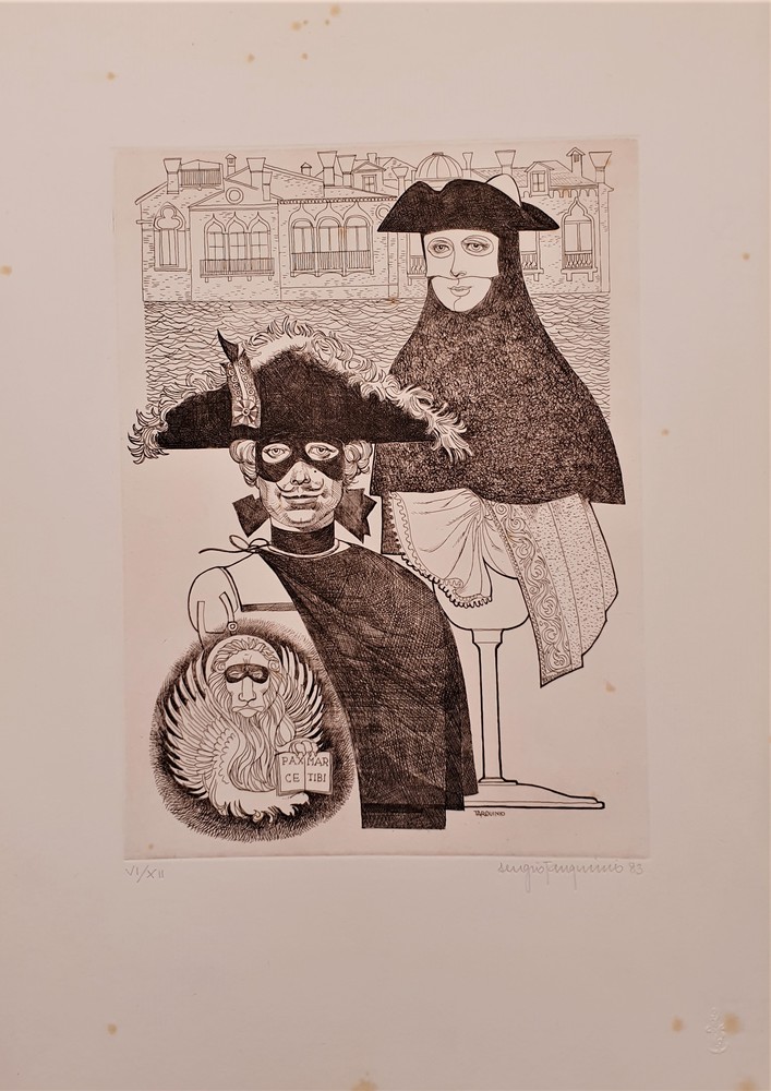 TARQUINNIO SERGIO (1925) Paesaggio con maschere veneziane, 1985 Acquaforte 35x50 cm Firma in basso a destra e tiratura VI/XII a sinistra, alcune fioriture