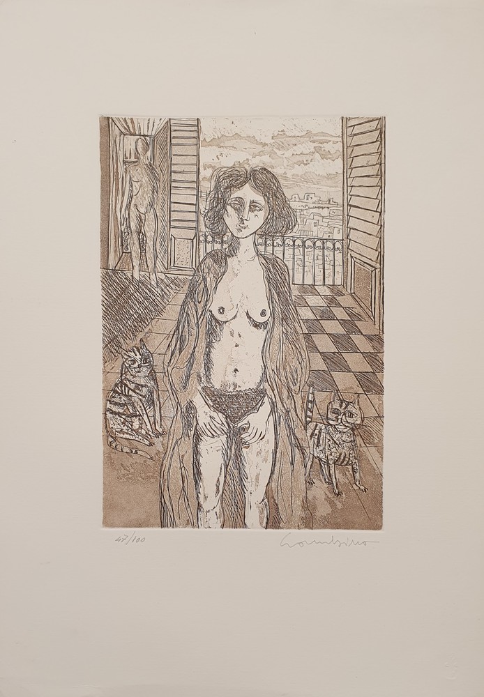 GAMBINO PIPPO (1935 - 2004) Ragazza con gatti Acquaforte 35x50 cm Firma in basso a destra e tiratura a sinistra 47/100