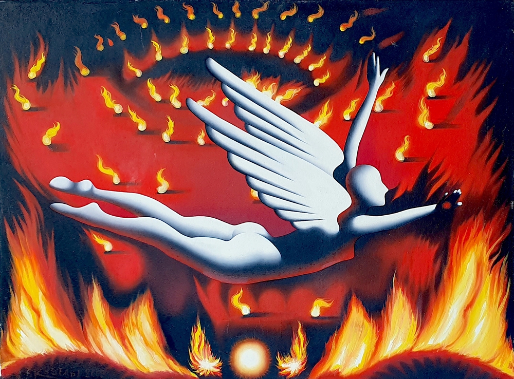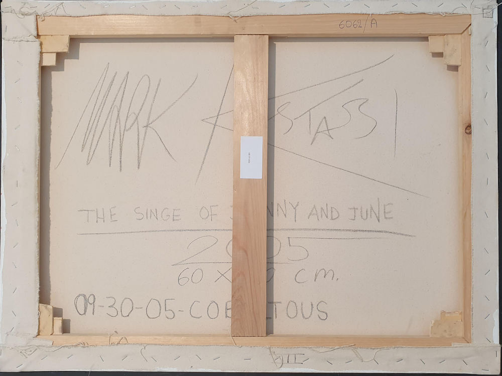 KOSTABI MARK (1960) The Sing of Johnny and June, 2005 Olio su tela 60x80 cm Firma e anno in basso a sinistra e al retro con titolo e data 09-03-05 Autentica dell'artista su fotografia