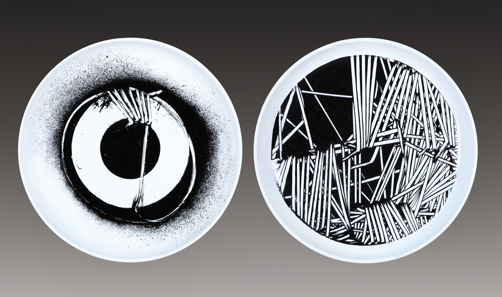EMILIO SCANAVINO Genova 28/02/1922 - Milano 29/11/1986 Senza titolo piatto in ceramica diametro cm. 32,5, esemplare 26/50, firma al retro. Senza titolo piatto in ceramica diametro cm. 32,5, esemplare 28/50, firma al retro.
