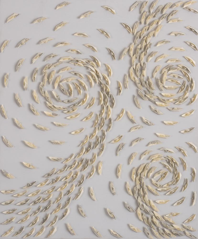 Riccardo Gusmaroli VORTICE BASILEA barche di carta su tela, cm 60x50 sul retro: firmato eseguito nel 2017 L'opera è accompagnata da autentica dell'Archivio Gusmaroli su fotografia Le barche sono state realizzate utilizzando le pagine della guida di ArtBasel