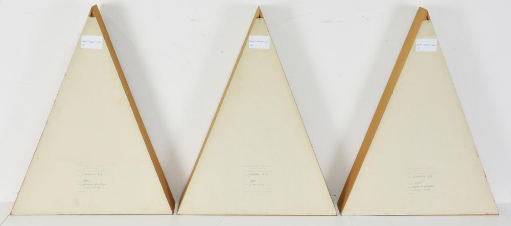 Alessandra Bonelli ALEPH 3-4-5 tecnica mista su cartoncino Schoeller entro teche piramidali, cm 51x40 ciascuno opera composta da tre elementi due delle tre opere firmate e datate sul retro: titolate e datate eseguito nel 1982-1983 (3)
