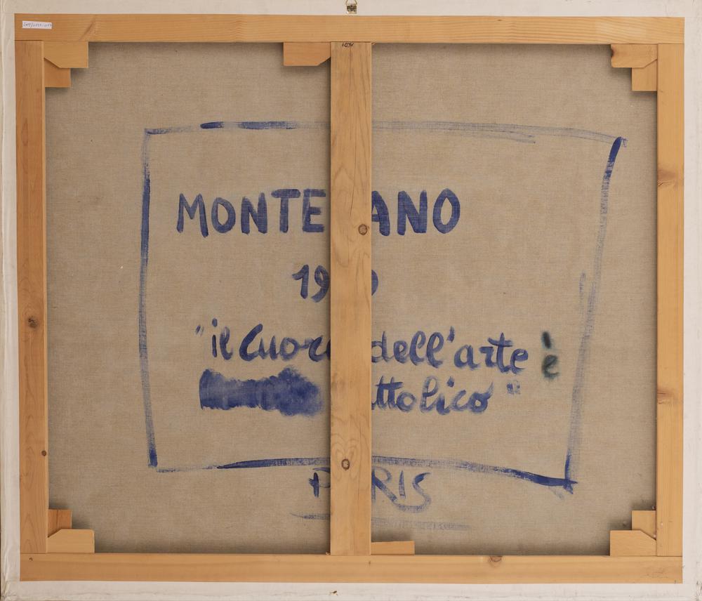 Gian Marco Montesano IL CUORE CATTOLICO DELL'ARTE olio su tela, cm 100x116 sul retro: firmato, titolato e datato eseguito nel 1979 L'opera è accompagnata da certificato di provenienza della Galleria Alessandro Bagnai, Firenze su fotografia Provenienza: Galleria Alessandro Bagnai, Firenze Collezione privata, Torino