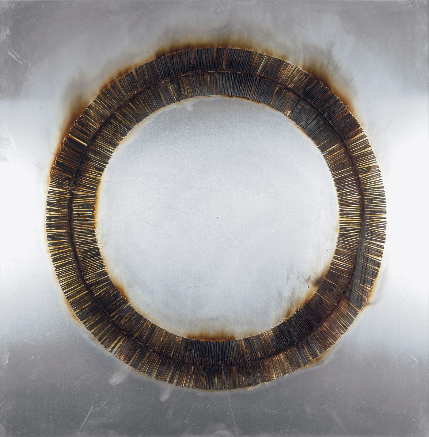 AUBERTIN BERNARD Fontenay-aux-Roses 1934 "Dessin de feu circulaire" 1974 90x90 fiammiferi su lamiera Opera firmata al retro Autentica dell'artista su fotografia rilasciata in data 15 marzo 2011 Già Galleria Il Centro, Brescia (etichetta al retro)