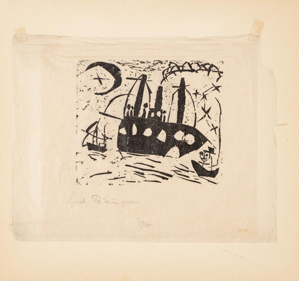 Lyonel Feininger FRÖLICHE SCHIFFSREISE (HAPPY BOAT RIDE) xilografia, cm 14x17, foglio: cm 23x30 firmato e datato eseguito nel 1925 Rarissima prova coeva conosciuta in soli 5 esemplari (più 2 postumi). L’esemplare riprodotto sul catalogo ragionato, appartenente al Cleveland Museum of Art, è uno dei due postumi Bellissima prova impressa in nero su sottile carta Japon. Grandi margini, traccia di ossidazione da vecchio passe-partout, alcune lievi pieghe al margine superiore, lacuna all’angolo superiore destro ampiamente esterna alla parte incisa Provenienza: Sotheby’s, Londra 1979 Collezione privata, Pesaro Bibliografia: L.E.Prasse, Lyonel Feininger. Das druckgraphische werk. Radierungen, Lithographien, Holzschnitte, Berlino 1972, W 146.