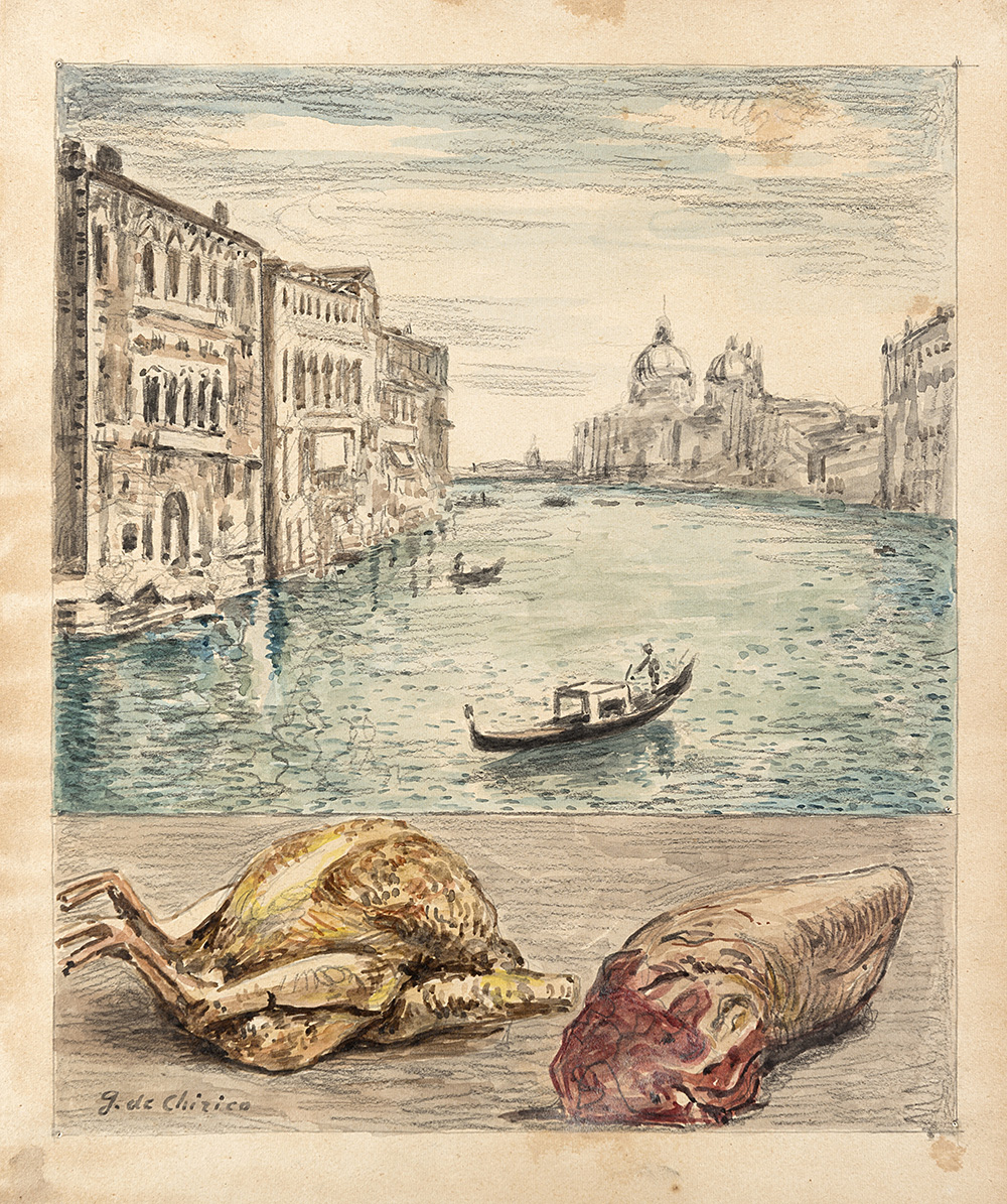 Giorgio de Chirico (Volos 1888 - Roma 1978)"Veduta di Venezia con pollo e...