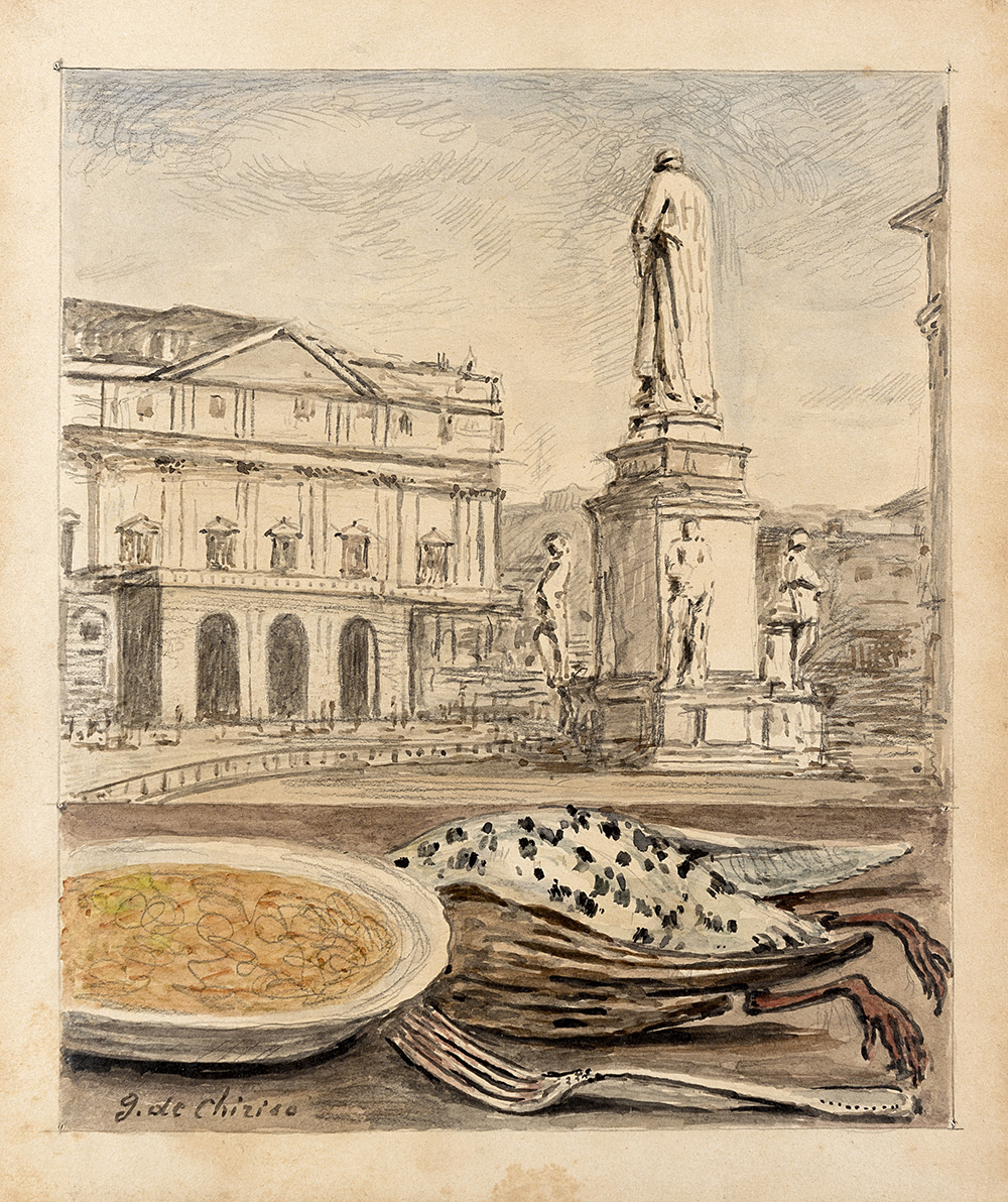 Giorgio de Chirico (Volos 1888 - Roma 1978)"Veduta di Milano con risotto e...