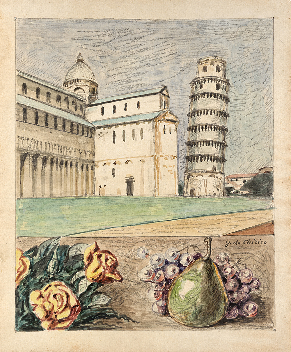 Giorgio de Chirico (Volos 1888 - Roma 1978)"Veduta di Pisa con fiori e frutta...