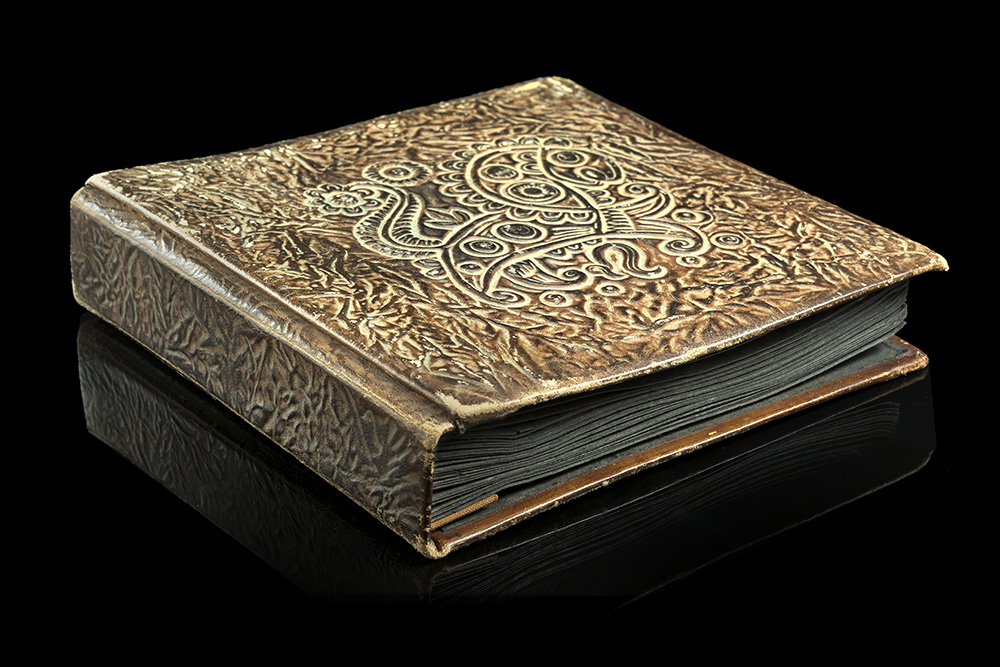 Brown embossed leather album containing twenty-five vintage gelatin silver prints mounted on single page.