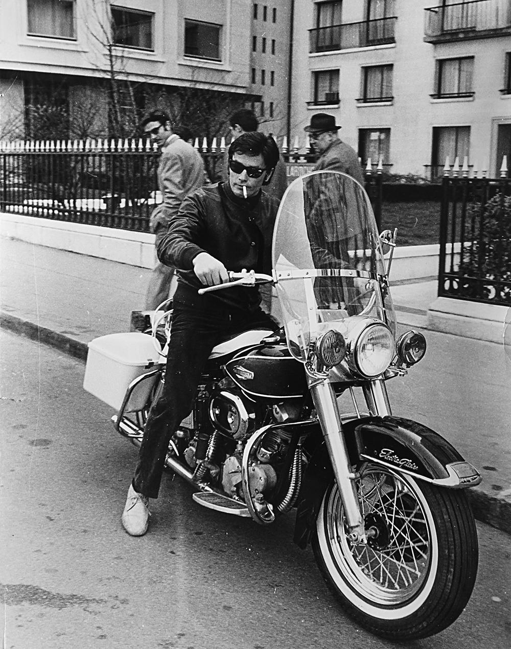 Alain Delon in sella ad una Harley-Davidson 1968